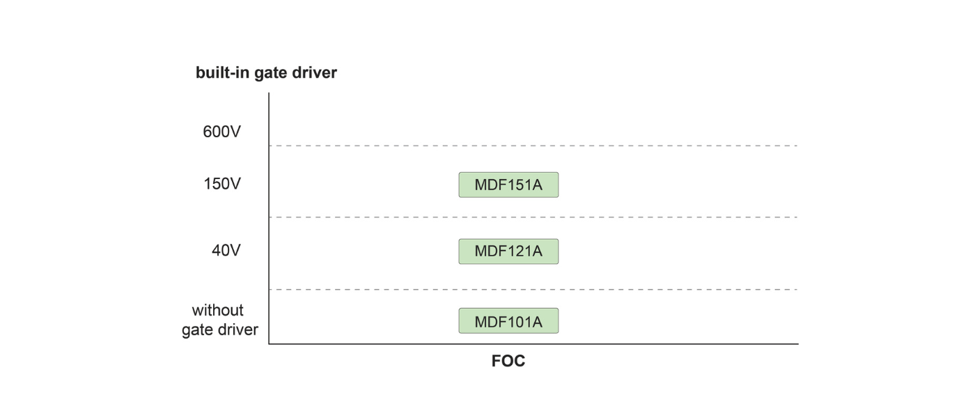 | MDF151A | FOC | 150V、N+N | 13V、21V | 5V/30mA、12V/300mA | 2.5~5.5V | 60MHz | 10-CH | 5 CH | 2 | -40~105 | QFN32、QFN40、LQFP48 |