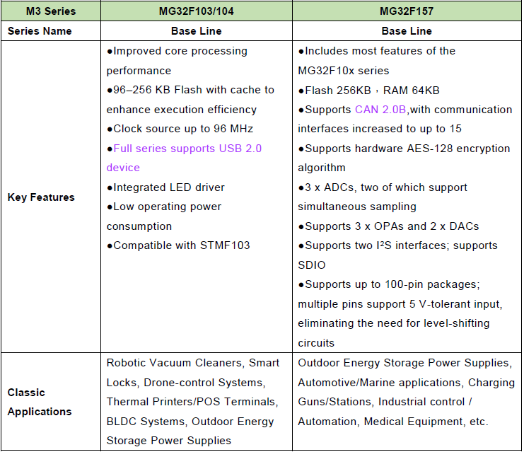 32-bit MCUs (microcontrollers), such as Arm® Cortex®-M0 / M0+ / M3, are control-oriented devices that highly integrate a CPU, memory, I/O, communication interfaces, and timers into a single chip. They are specifically designed for real-time control, low-power operation, and long-term stable performance. Their commonly used functions include GPIO control, timing and interrupt handling, PWM, UART / I²C / SPI communication, and low-power management. Among them, Cortex-M0 / M0+ focus on low cost and low power consumption, while Cortex-M3 provides higher performance and more advanced interrupt control capabilities.
