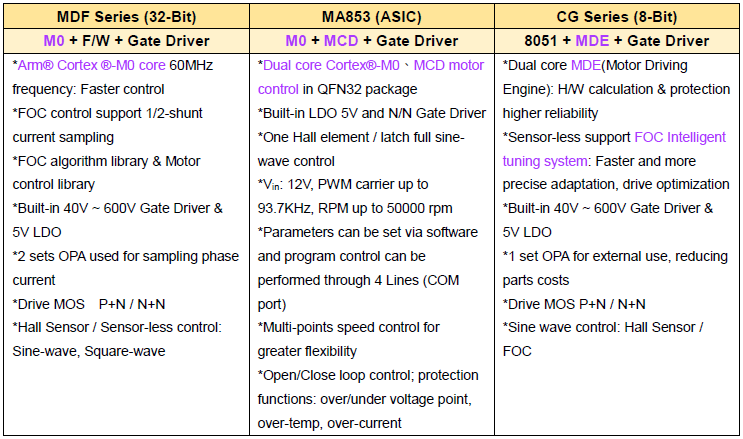 MDF Series: https://www.megawin.com.tw/products-sub/BLDC-ARM-Cortex-M0-Line