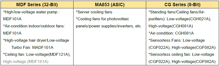 Since 2023, Megawin Technology has been actively expanding into the new-energy and energy-saving markets, successfully developing and mass-producing MCUs dedicated to BLDC motor control, with steady overall growth. The current product lineup includes three major categories: the 32-Bit MDF series, the 8-Bit CG series, and ASIC chips. Megawin Technology has also been continuously releasing multiple BLDC application solutions, covering a wide range of products such as high-speed hair dryers, low-voltage ceiling fans, hall-sensor fans, high-performance fans, low-voltage water pumps, air conditioners, power tools, and server fans.