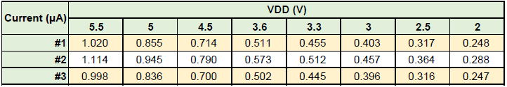 此外,MG32F02K系列具备极低的休眠功耗表现,得益于芯片完善且周全的低功耗架构设计,在低电压VDD条件下仍能维持优异的功耗水平。以实际数据为例,当VDD= 3.3V时,其休眠电流约为500 nA (0.5μA);而当VDD降至3.0V时,休眠电流可进一步降低至约400 nA (0.4μA)。