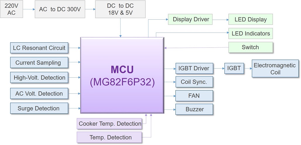 本電磁爐方案採用 8501高效主控晶片(MG82F6P32)與單管設計,支援 AC 220V 輸入,最高輸出功率達 2.2 kW,兼顧強勁效能與穩定性。並內建6段功率調節、保溫、檢鍋與定時功能,並具備完善的電壓與過溫保護,滿足安全與便利的使用需求。