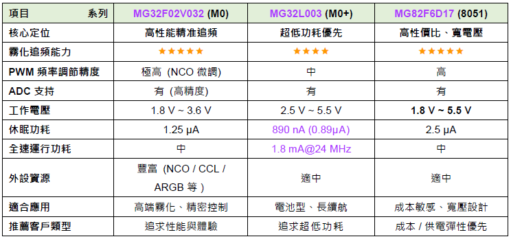 而 8051 架構的 MG82F6D17系列,雖然整體運算性能不及 MG32F02V032,但在霧化追頻控制方面表現與MG32F02V032系列旗鼓相當,同時支援1.8 V~5.5 V的寬工作電壓範圍,設計彈性高、適配性強,是一款兼顧性能與成本的高性價比選擇。