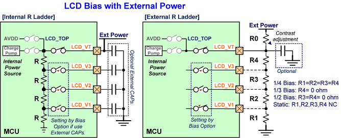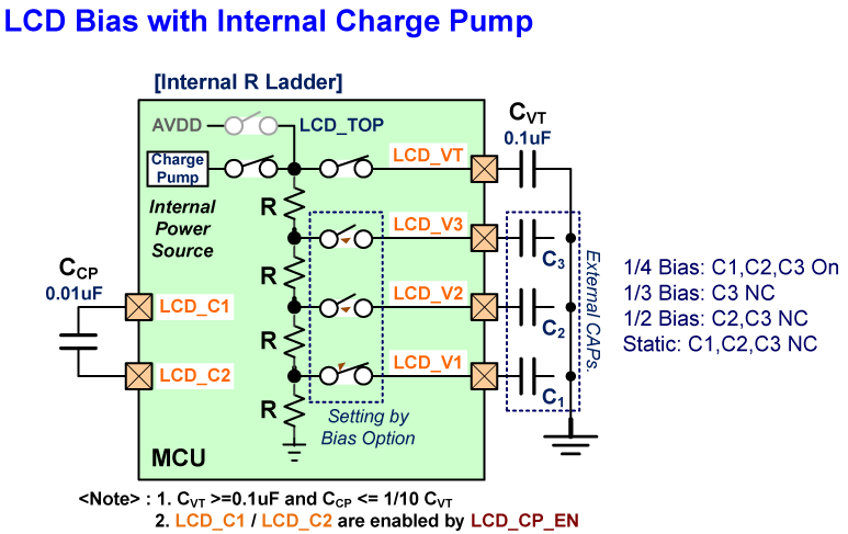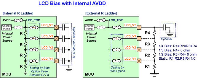 市面上的顯示技術依用途與成本不同,可分為彩色LCD(Color LCD)、單色LCD(Mono LCD)及 LED顯示器等類型。以LCD為例,其面板通常包含 COM(共用電極) 與 SEG(段電極)。MCU可透過內建或外部的 LCD驅動器,利用占空比(Duty/COM)與偏壓電壓(Bias),產生驅動LCD所需的模擬電壓波形,以點亮對應的段或圖案,實現依使用者定義的畫面顯示。