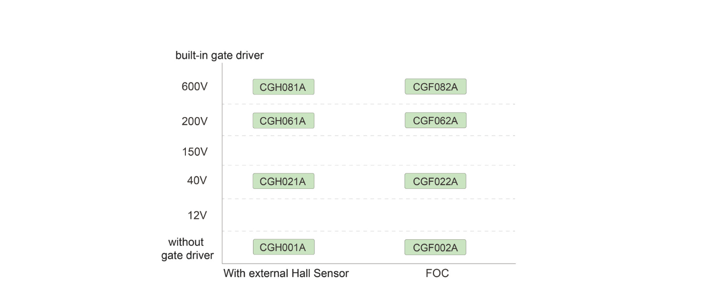 | CGF062A | FOC | 200V、N+N | 15V | 5V/30mA | 4.5~5.5V | 48MHz | 10Bit、8-CH | 1 CH、16-Bit | 1 | -40~105 | QFN40、LQFP48 |